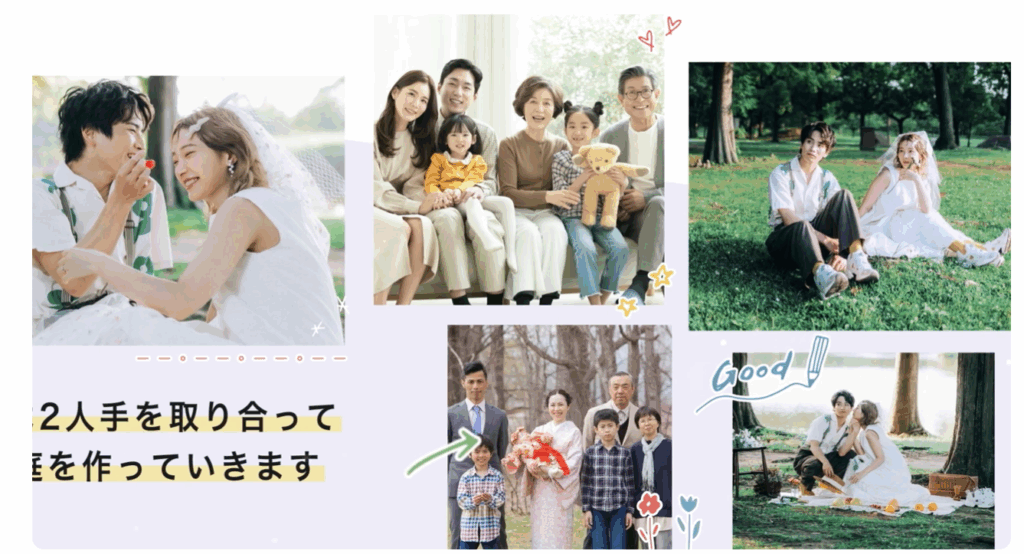 結婚式ムービーでは、写真や映像が横にスライドする横スクロール演出を取り入れることで、動きにリズム感を生み出します。