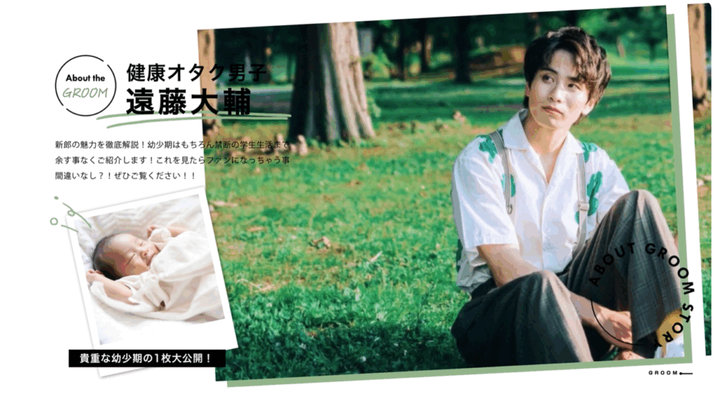 お二人の人生をおしゃれな雑誌風デザインで紹介する、ユニークな演出が詰まったプロフィールムービーです。表紙から始まり、ページをめくるように生い立ちや馴れ初めを紹介。まるで世界で一冊だけの雑誌を作るように、お二人の物語を楽しくわかりやすく伝えられ、ゲストも夢中になる特別な一作です。